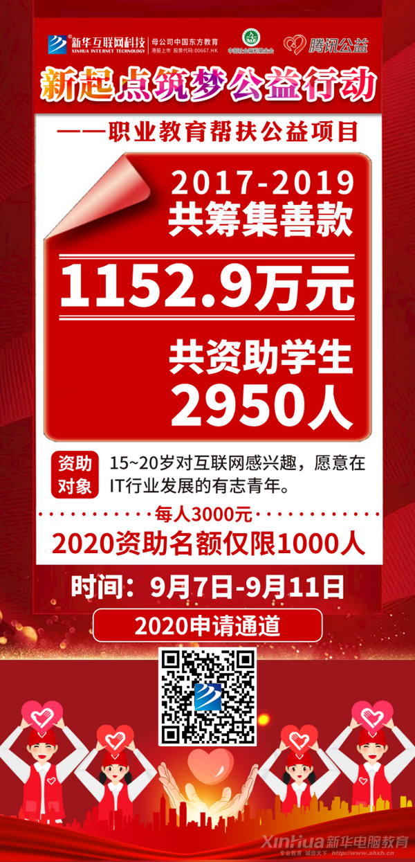 新华近年来推出拾柴计划,筑梦公益行动,志在5年内帮助10000名贫困学生。每年的9月9日,全国30所电脑教育院校会同步启动99公益活动,通过“奖助勤勉”和“扶贫扶智”等举措,集“关爱、锻炼、激励、教育”为一体,大力开展精准扶贫、教育扶贫,对贫困青年进行技能培训,并提供就业机会,并让更多人凭借自己的学习和努力,实现人生梦想。